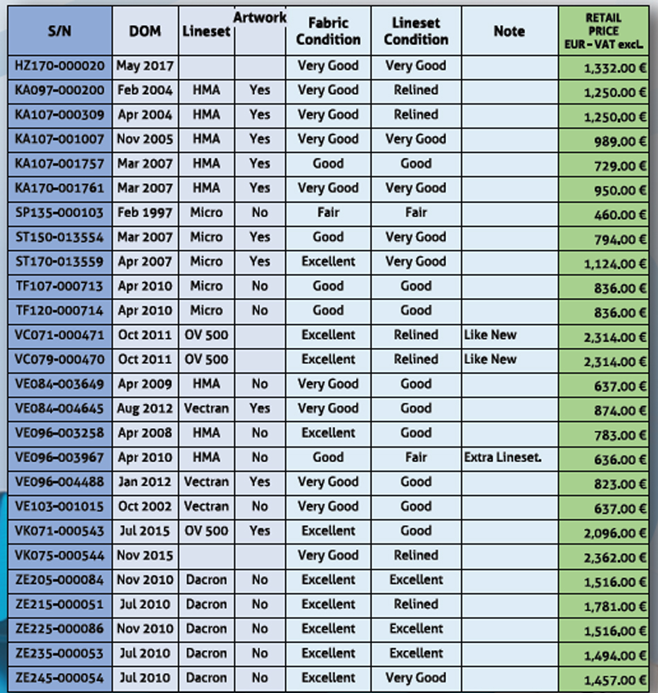 - See the info in the list on each canopy's fabric and lineset condition.