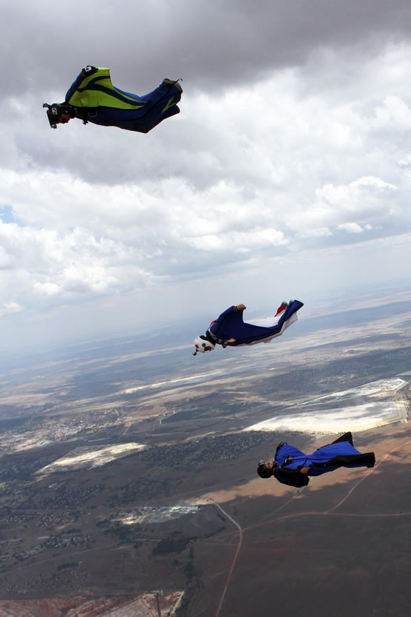 The skies over South Africa were full of smiling skydivers last weekend. Two planes were flying for three days, a PAC and an “Atlas Angel” (a single-prop plane with origins in the South African military). Scott Plamer and Paul Ferriman came out to fly fast and steep with the freeflyers, and Lawrence de Laubadere and I, along with local organizer Oliver Nothen, kept the wingsuiters busy with formations, vertical stacks, and docked dives. Belly flyers did some 2-plane formations, rare in this part of the world, with some very happy campers achieving the 16-ways required for a PASA D-license.